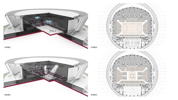 設(shè)計功能時,比賽館與訓(xùn)練館并列布置,比賽館內(nèi)固定的看臺采用 U型三面布置,活動看臺圍合競賽場地四面布置?;顒臃指糍惻c訓(xùn)練館之間。賽會館、訓(xùn)練館分別承擔(dān)比賽和準(zhǔn)備活動。轉(zhuǎn)化成表演方式后,訓(xùn)練館可作為文藝表演功能的舞臺。