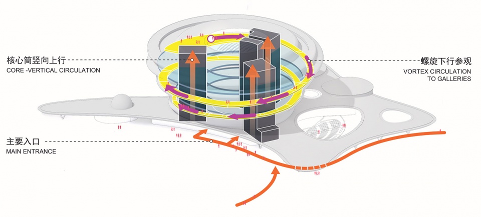 科技館主體分為六層,地上五層,地下一層。由上至下設(shè)計的室內(nèi)游覽線路。游客可以先乘坐核心筒升降機,直升至頂層的360度觀景平臺,遠(yuǎn)眺大海、城市景觀。接下來,他們還參觀了前沿科技和航天展覽廳,斜坡、四層的海洋和生命科學(xué)展廳、三層的數(shù)學(xué)與科學(xué)展廳、二層的多媒體互動體驗區(qū)和兒童樂園。